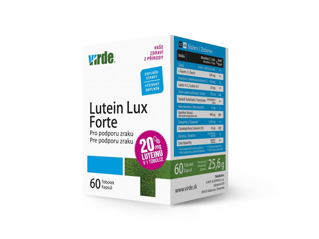 Lutein LUX Doplněk stravy 30 nebo 60 tobolek Doplněk stravy Přípravek Lutein LUX je určen pro podporu zraku. Základem receptury jsou karotenoidy betakaroten, lutein a zeaxanthin, zinek, obsažen je rovněž L-taurin. Zinek pomáhá udržovat normální stav zraku, spolu s vitaminem C přispívají k ochraně buněk před oxidačním stresem.